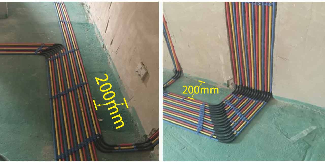 單管單線施工工藝地面配管必須使用10(mm)PVC阻燃線管(公司專利材料),并距墻體200mm間距沿墻敷設(shè),多根管敷設(shè)時,必須并行、整齊排列,盡量減少管線的交叉和重疊。